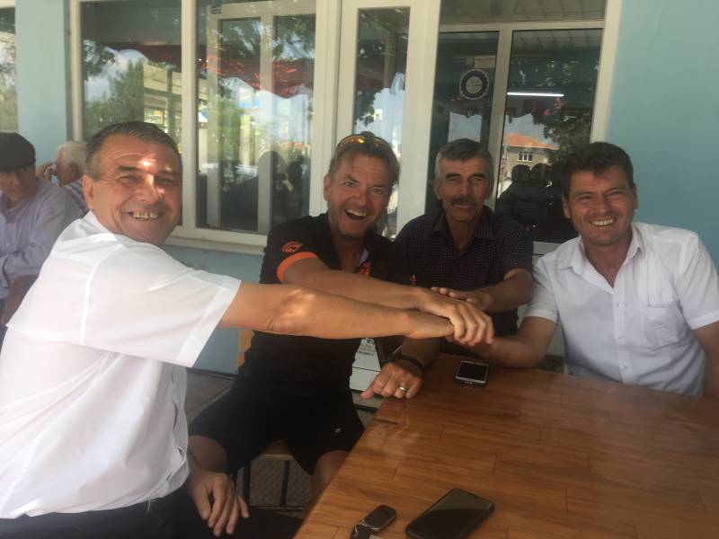 After 15 kilometers Turkey, just after Ipsala, we leave the highway and reach the village Esetçe. On a square in the small village we immediately get to know one of the aspects of Turkish culture. We see three terraces that are all populated by only men chatting and drinking tea. We walk into a shop to get a soft drink and an ice cream. Once we are outside, a friendly man approach us: "Hollanda?" and he points to the shirt of Roelie, which has 'Nederland' on the back . We nod and he starts to speak Turkish. We soon understand that he invites us to drink tea with him and his friends. His name is Esu and his friends Hasan and Ibrahim. We attract attention in our cycling clothes and with our foreign heads, Roelie is the only woman on the men's terrace. They ask how we came with the bikes and what our plans are. With a lot of gestures and use of our iPhones (photos, navigation apps and our website in terms of traveled and planned route around the world) we make a first acquaintance with Turkish friendliness and genuine interest. What a warmth these people radiate, it goes through all language barriers. A second round of tea is offered, but we have to go further because we want to go back to the coast again and that is another 50 kilometers. We explain with Google Translate that we have to cycle for another hour or three, then set up a tent and cook.