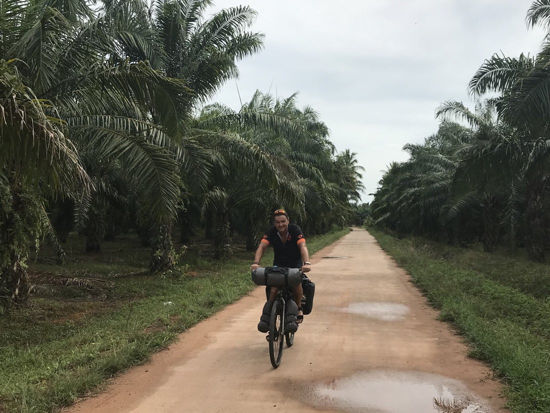 Back to the beauty and the issues of this day. The palm oil tree (of course that is not called that name but we call it that anyway) is in fact a beautiful tree, from its trunk various types of ferns grow, the soil is not kept bald (as for example with olive tree plantations in Europe), but is overgrown grass. And if there are small, quiet, winding paths through the plantations that are great for cycling, you will not hear us complain about palm oil. We find it much more fun to cycle through palm oil plantations than, for example, those desolate corn fields intended for animal feed that have “accompanied” us throughout Europe.
