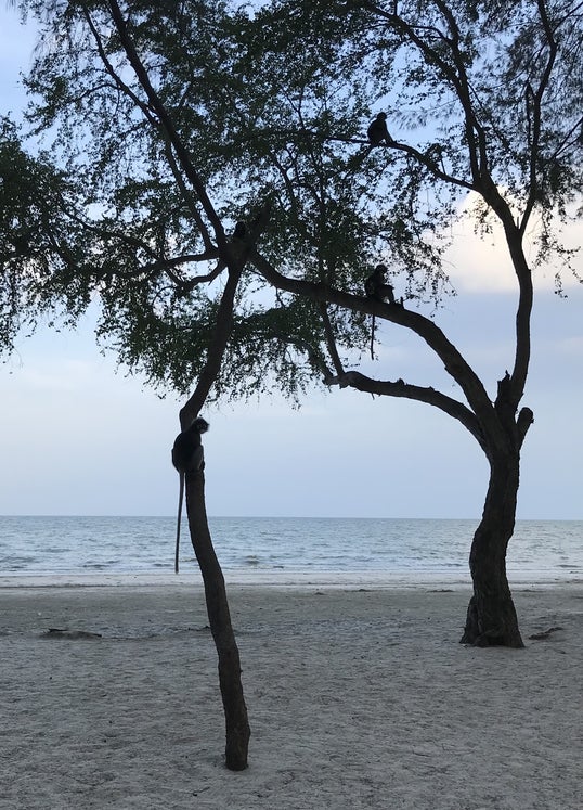 The next morning we have cycled less than a kilometer when misery strikes. Harry's iPhone is slowly turning black. Just like then, two days before Bangkok! And we know now that the phone can not be repaired. At least not by an Apple Store. This can not be true! We blame the cord that we previously bought in Thailand at an electronics and telephone store. The cord has worked fine for 2 months but is involved in the demise of now 3 iPhones. Incredibly. And unfortunately it doesn't end there today. We cycle wrong, we lose a fiber cloth (almost indispensable for us on the way), one of our super light seats breaks, we suddenly run out of five pegs, calf-thick thick black muddy blubber between the beach and the sea and we have to pay both the entrance fee for the National Park as the campsite fee where previouslyother cyclists did not had to. It's all doom and gloom today. But…, despite the fact that it is Sunday, we have scored fresh vegetables, can cook a wonderful meal and pitch our tent in a top spot in the Khao Sam Roi Yot National Park. A group of dusky leaf monkeys come round close to sunset. The monkeys have remarkable white circles around the eyes and a very long tail. They are kings in jumping from tree to tree and laze and eat on extremely slender branches. Unfortunately they only give a short beach show and at sunset they are already back in the forest behind.