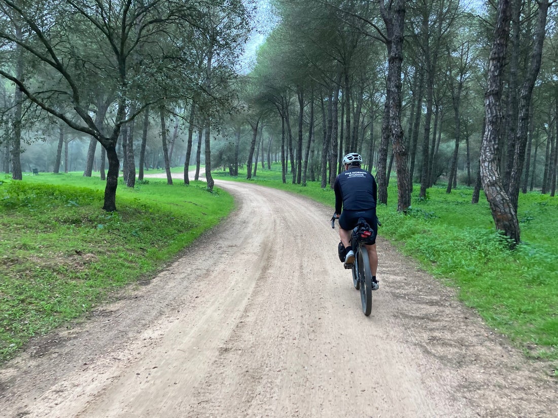 Across the street we find a café and sit near a patio heater with a café con leche. We don't really warm up and Harry's fingers are snow white again. Various items of clothing are removed from the bags and put on before we continue. Again the pedaling is intense before we arrive at a nature reserve a little warmer. Oh yes, we have been cycling on the off-road route Transandalus for some time and here through the woods it is beautiful again. Unfortunately, visibility is still limited.
