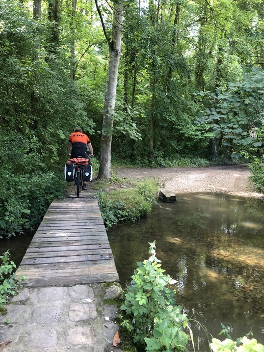 On day 5 we cycle into France along with the first altitude meters. So far we have cycled through the Dutch-speaking part of Belgium. We cycle through French Flanders and although the place names are absolutely Dutch, French has substituted Flemish here. Today it immediately becomes clear that our French is poor. In the afternoon we order a cup of coffee at a village cafe, that went well, but the pear tartin that we had ordered as a sweet treat with the coffee turned out to be a leek quiche. And in the evening we arrive at the campsite that we saw on GoogleMaps. However, the camp hostess stops us and we understand that we are not welcome. We try to make it clear that we do have a sanitary pass, that's what the French call proof that someone has been fully vaccinated or tested negative. Stricter measures are just in order in France and we wonder if we did the right thing to travel to France. A campsite around the corner welcomes us as normal. Only then does the penny drops and we suspect that the sanitary building on the first campsite with mainly permanent places is not open. Yes indeed "pas de sanitaire". We can laugh about it now, but we also realize that the French language could become a thing in the coming weeks...