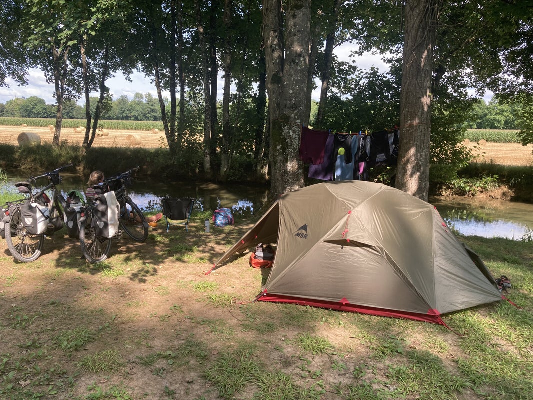 At camping Lac du Der we are in a nice spot along a stream at a ridiculous distance from the sanitary building. We take the bike for a pee and we ask the Dutch neighbors with their caravan if we can charge our phones with them. We again adjust the route a bit so that we can go to the Decathlon of Saint Dizier to buy a new cushion. One of the pads has always had a valve problem and was difficult to inflate and deflate, but now it is leaking and needs to be checked regularly at night. With a new pillow we cycle on to Bar-le-Duc. The town is located in a valley and in the last kilometer we plunge almost 100 m down where we can camp in the backyard of a castle. The supermarket is a stone's throw away as the crow flies, but it is almost half an hour's walk via a path with 350 steps that takes us 70 meters higher. It's hot this afternoon and sweat is pouring down our faces. As announced, the sunny and hot weather gives way to wetness towards evening. The wetness eventually turns into serious thunderstorms that linger for a long time in the valley of Bar-le-duc. Fortunately, we keep dry under the tarp. To repeat one more time: we are so glad we took it with us on this trip. We are curious whether the tent will endure well. We have read a review that the tent is not sufficient in torrential rain. But the MSR tent withstands the force of nature much better than our previous Nigor Guam and Exped Gemini tents, but is also a bit heavier than our previous tents. The last concern of the torrential rain is whether we will wash away in this valley where the last few weeks have seen the terrible images in Belgium and Germany, but luckily that also goes well.
