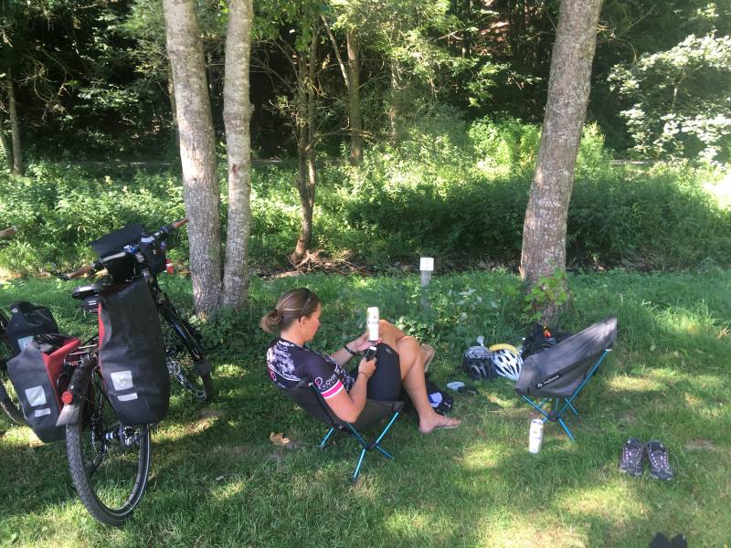The border with Luxembourg is partly formed by the river Our. We cycle about 15 km across Luxembourg territory until we return to Germany with a ferry over the Mosel: our 5th border crossing within 5 days. We follow the Mosel a bit to the east until Konz, a town that lies at the spot where the Saar flows into the Mosel. The Saar is a "silent river". Due to a number of high dams the flow of this river has at least optically stopped. We will continue to follow the Saar for two days. Now we cycle a little 20 km until we arrive in Saarburg. Saarburg is a small old town with a castle on a high rock, a cozy square with few terraces and a water trap in the center where the stream Leuk flows into the Saar. A little further on this tiny river we find our campsite which - again - is occupied with almost only Dutch people. The tent area is right on the bank of the Leuk. There are two other bicycle couples and we chat a bit. One couple comes from Ost Friesland (Germany) and cycles from the Bodensee to Katwijk. They have great tips about our route towards Strasbourg. The other couple comes from Groningen (The Netherlands), but is originally Frisian.