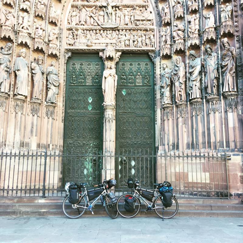 From camping Strasbourg we cycle into the old center with the special cathedral of which there is only one tower instead of two. On Sunday mornings it is quiet in the streets where surprising rivers and brooks flow through in different places. Via a modern white slow traffic bridge we cross the Rhine and enter Germany again.