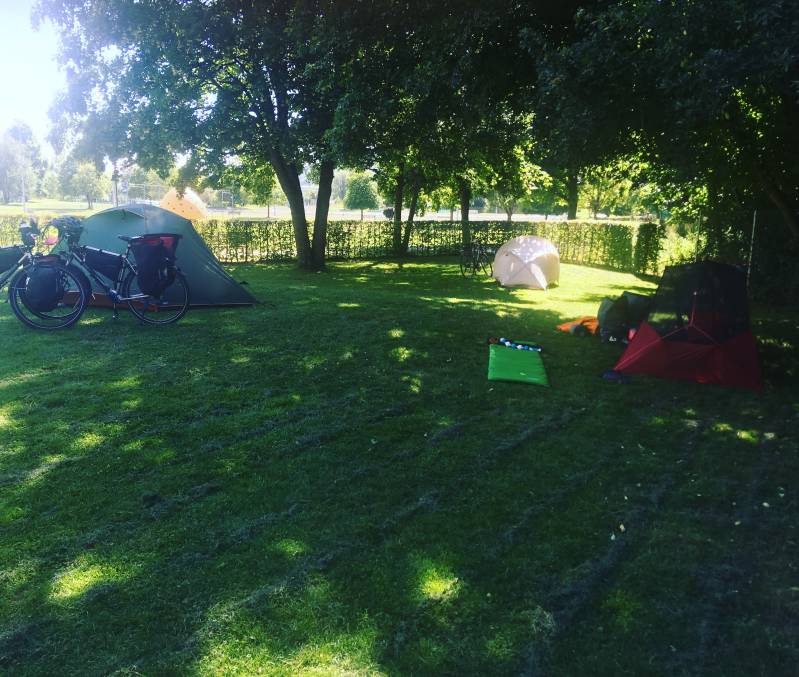 Tuttlingen is a nice, lively town, but more important: they have a camping spot for (only) cyclists! Camping is free and you do not have to register or register anywhere. There are public toilets near the tent area; we are in Germany, so these are generally clean. If you want to use the neat shower rooms and non-public toilets, you can get a key at TuWass pool for € 5 per person, couple or group! This is awesome! This should be followed in more places! We are already early (around 3 pm) on this camping spot. There is no one and we are looking for the best place. We hope that more cyclists will come. That wish comes true, because late in the afternoon the field is half full with eventually 10 cyclists, successively: a German, a Canadian, a Belgian, an English and four Frenchmen (and we two Dutch people, haha).
