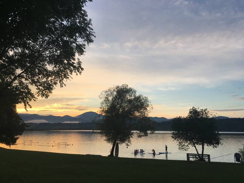 Our second full day in Bosnia-Herzegovina brings us to Lukavac, where we should find a campsite that is not far from our route. The campsite is located on a lake near this ugly city with gray industry and poverty. After a visit to a supermarket we lay down the last kilometers against a slope with a percentage of 12-15%. What follows is an oasis of peace, greenery and a beautiful lake in the distance. And a barrier, which is closed. After waving for 5 minutes, we get the attention of a gentleman who is napping a hundred meters away in a kind of dwarf kiosk. He sees us and takes another five minutes to go to our side. After we answer his question of whether we only spend one night here with a hesitant yes, he opens the barrier and gives us the freedom to choose a beautiful spot among the trees on the edge of the lake. The lake has a kind of day recreation beach, which is completely empty on a noisy aggregate and about ten burly guys with cars, a bus and three boats after. Huh? It appears that three days ago a man drowned in this lake and that since then the police have been trying hard to find this man. As long as that is not the case, it is more prohibited territory. We look at the search all afternoon, which is discontinued at twilight.