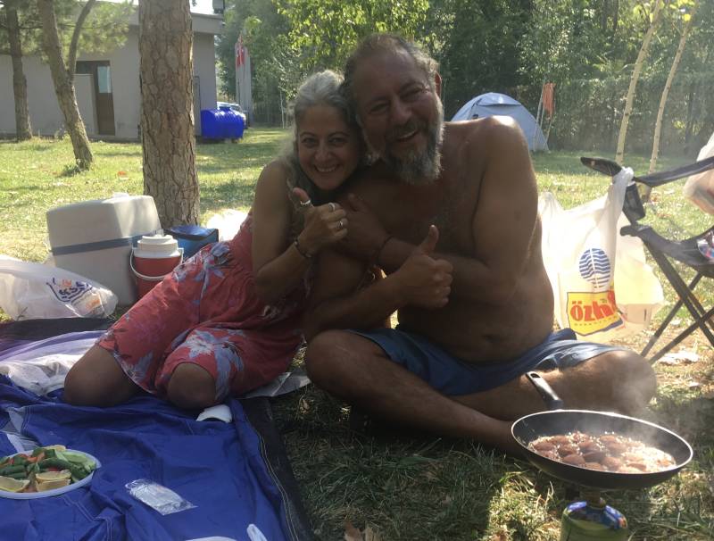 One of the dogs from the pack, who lives on the campsite, has walked with a leather slipper. A moment later the owner of the slipper appears on one slipper and one bare foot. Her husband follows. It seems like a coincidence. They saw us sitting and wanted to take a closer look, the dog has accelerated the acquaintance: Ahmet and Zuhal also join the barbecue. Two friends of the cycling couple from Bursa complete the now large group. Meanwhile, a loudspeaker box is hung in the tree and Turkish music completes the party. We dance in a Turkish way and around us the tent field is filled with all kinds of small tents.