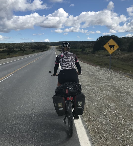 But on the day of departure, the sun is shining! Before we turn our back on Ushuaia, we first cycle on the boulevard and we pose for a moment at the large letters of Ushuaia on the harbor. After the photo session we really stand on the pedals and turn our wheel to the north.