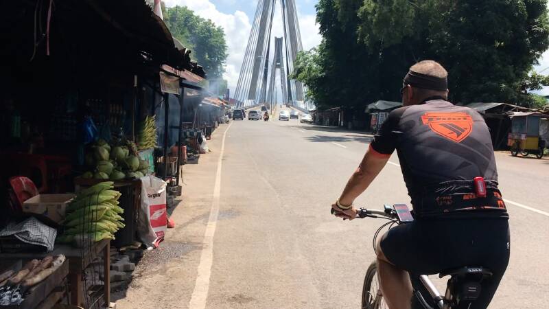 Many days to go on this tropical island off the coast of Singapore. We explore the attractions that Batam has to offer and find very few. The Barelang bridge in the south and a cycling route in the north are highest noted, 70 and 60 kilometers respectively. On a Saturday morning we venture on the road in the direction of the bridge. It is already busy with scooters, cars, buses and trucks. After an hour of cycling it is fortunately a bit quieter on the road. We see (and smell) a lot of durian stalls along the side of the road, but the oh-so-delicious rambutan is also being sold. We buy a bag to eat when we arrive at the bridge. A viewpoint is made for the bridge and quite a lot of tourists have come to it. After the recent architectural mecca of Singapore, the Barelang bridge is not that impressive. We cycle further to the bridges that connect more southern islands to Batam. Finally it is quiet on the road. After bridge four we turn around and see dark clouds hanging above Batam Center. A little later we undergo the heavy tropical shower and we look forward to a warm shower since a long, long time.